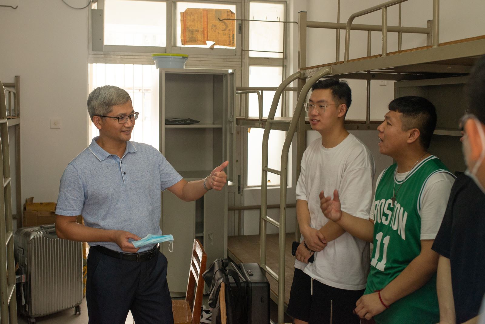 在新生宿舍,胡书记与同学们聊起了家常,不仅询问了同学们的家乡籍贯、到校方式、宿舍的设施设备等情况,更是关心同学们到校后的适应情况,并嘱咐同学们遇到困难,及时联系学校和老师们给予解决。胡书记鼓励同学们在学校养成良好习惯,尽快适应大学生活,磨砺坚强意志,树立远大理想,练就过硬本领。陈卓武副校长特别嘱咐大家要按照学校疫情防控要求继续做好安康打卡,科学戴口罩等防控措施,警惕电信诈骗,确保财产安全,希望同学们尽快调整自己,适应大学,加强锻炼,强健体魄,圆梦广工。