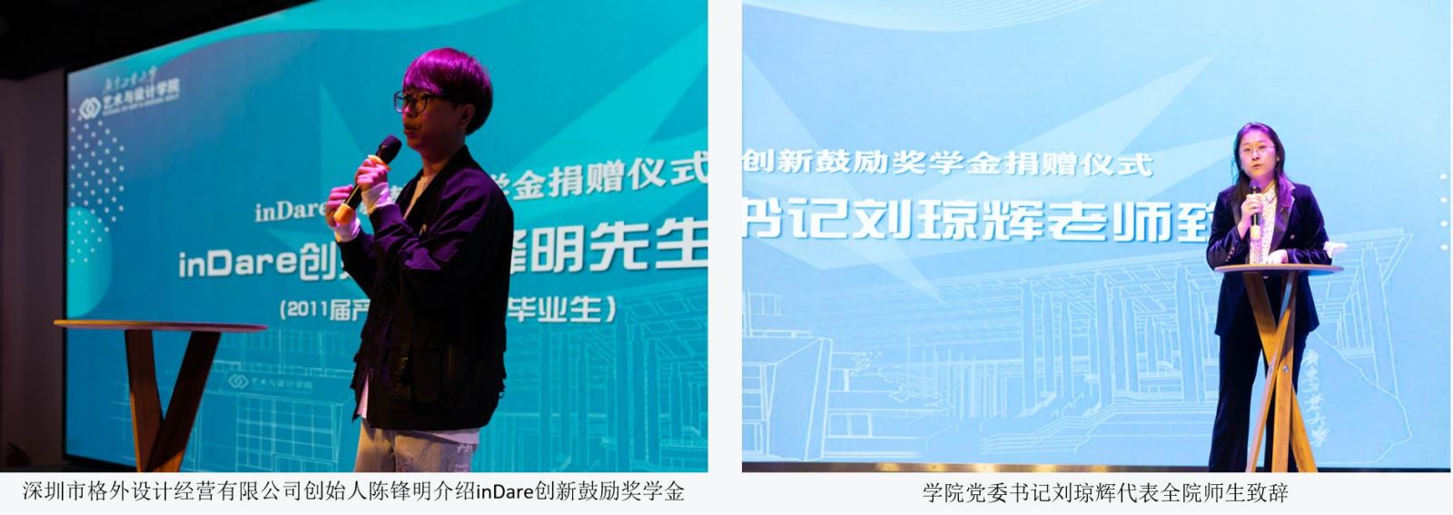 深圳市格外设计经营有限公司创始人陈锋明向大家介绍了inDare创新鼓励奖学金。“我想为母校做点事,感谢母校对我的培养,即使在毕业以后老师们依旧关注我的发展”,陈锋明校友这样讲述自己捐款设立奖学金的初心。学院党委书记刘琼辉代表全院师生致辞,感谢深圳市格外设计经营有限公司校友们尊师惠生的善举并致以崇高的敬意。她表示,学院的发展离不开校友们对母院一贯的热心支持和无私奉献,希望全体师生常怀感恩之心,以深圳格外设计经营有限公司校友们的高尚品质为榜样,不断创新,勇攀高峰,培养更多社会有用之才。