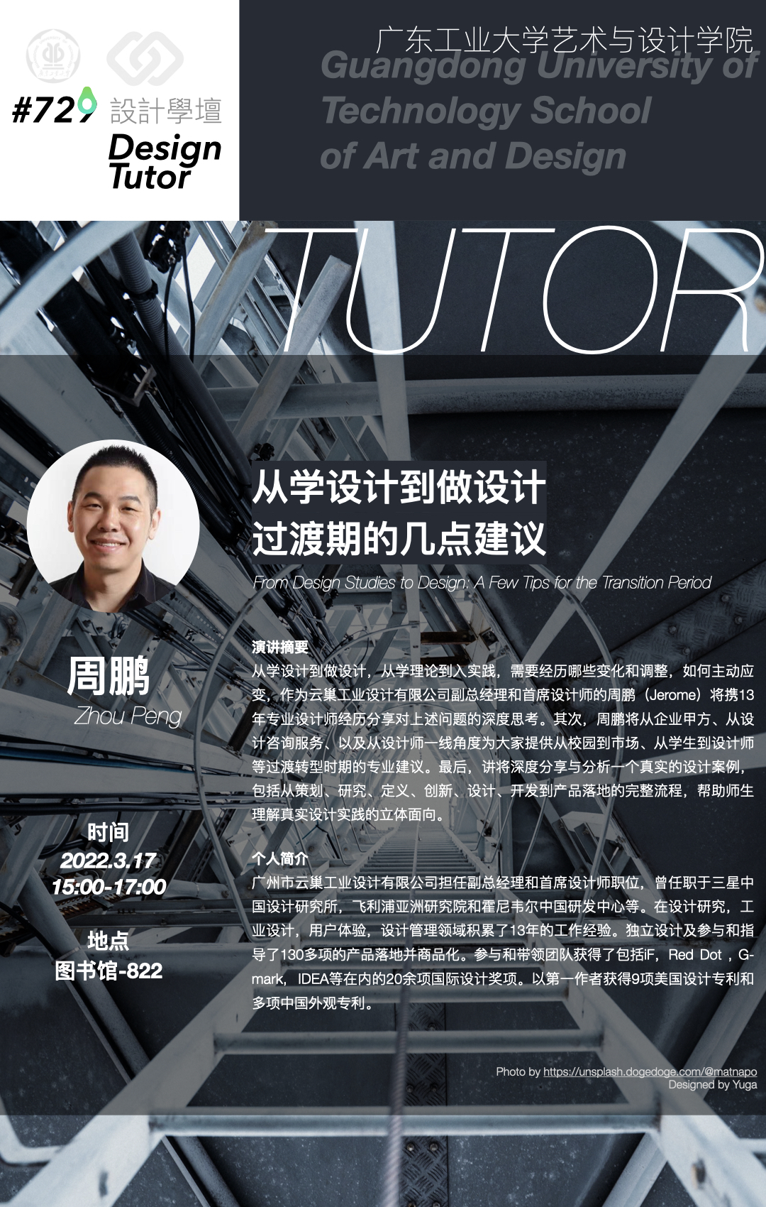 从学设计到做设计,从学理论到入实践,需要经历哪些变化和调整,如何主动应变,作为云巢工业设计有限公司副总经理和首席设计师的周鹏(Jerome)将携13年专业设计师经历分享对上述问题的深度思考。其次,周鹏将从企业甲方、从设计咨询服务、以及从设计师一线角度为大家提供从校园到市场、从学生到设计师等过渡转型时期的专业建议。最后,讲将深度分享与分析一个真实的设计案例,包括从策划、研究、定义、创新、设计、开发到产品落地的完整流程,帮助师生理解真实设计实践的立体面向。