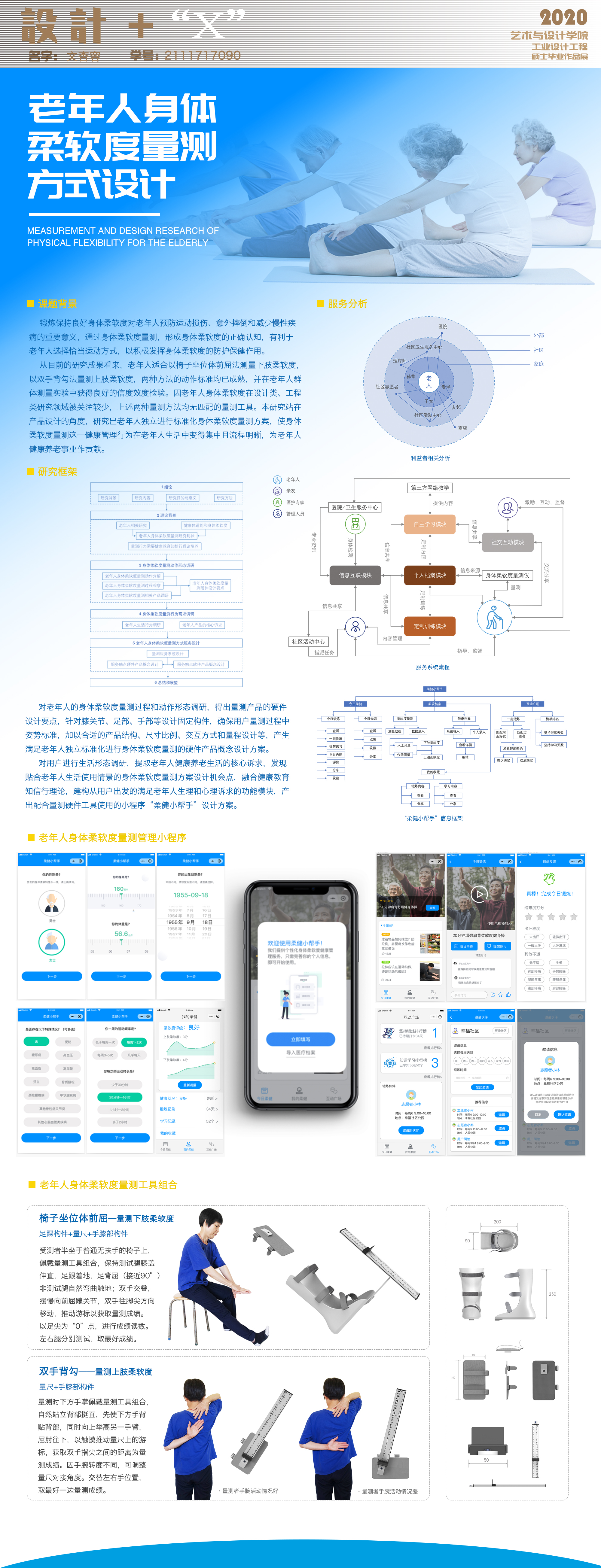 老年人身体柔软度量测方式设计,由硬件量测工具组和软件“柔健小帮手”小程序组成,让老年人能够在硬件工具的帮助下,独立完成有效的身体柔软度量测,并记录、可视化、长期追踪量测数据,让身体柔软度量测这一健康管理行为就像称体重一样平常,在老年人的健康养老生活中变得行为集中且流程明晰。通过长期的身体柔软度量测跟数据跟踪管理,帮助老年人对身体柔软度的正确认知,为其选择合适的运动保健方式提供可量化指标,对老年人预防运动损伤、防摔倒有重要意义。本设计以体育医疗领域成熟的身体柔软度量测方法理论为研究基础,补充了老年人身体柔软度量测工具和流程方面的设计缺失,还希望对建立国民体质数据库、优化公共卫生管理、减轻医疗负担等有所帮助。