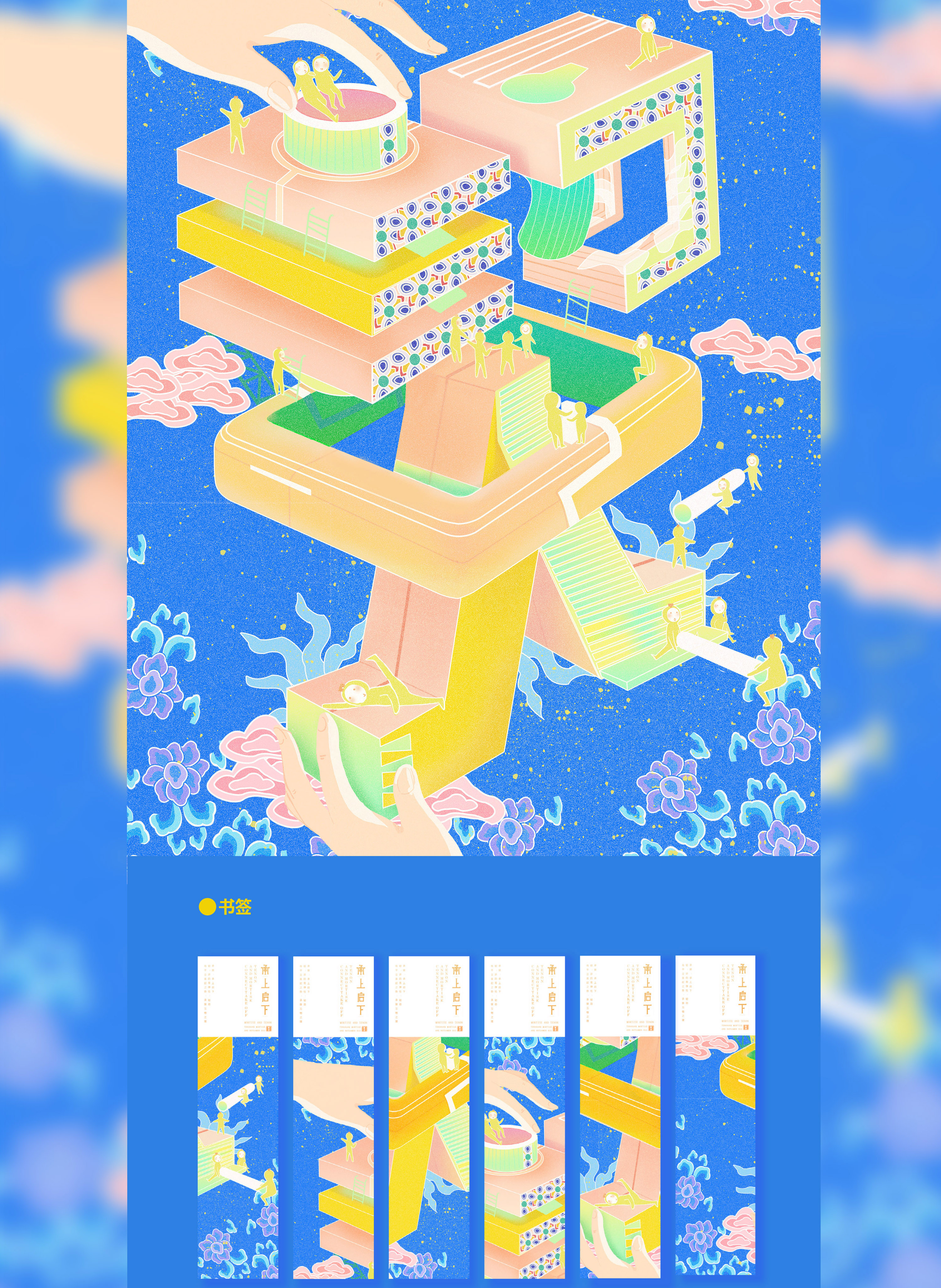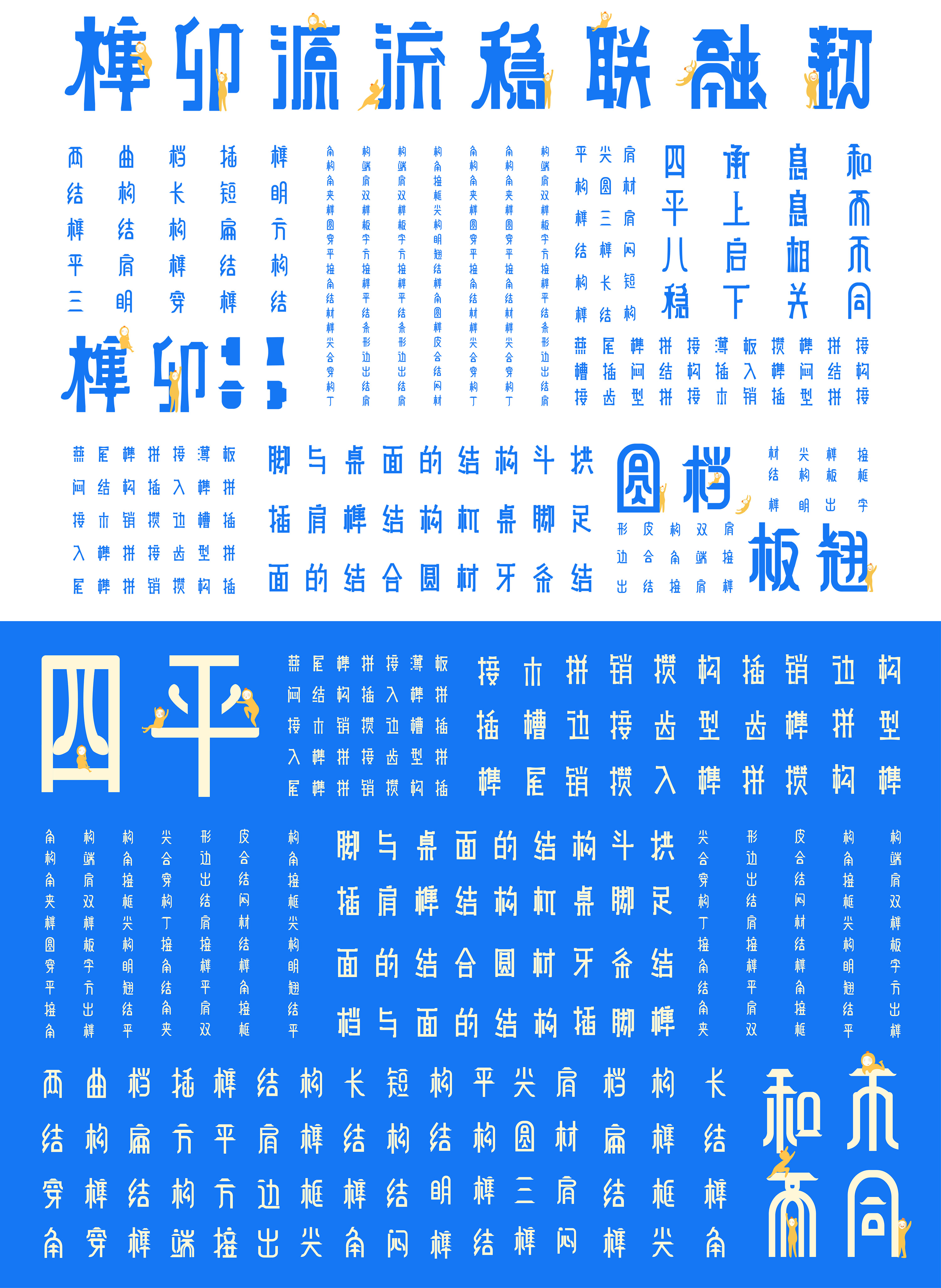 该课题以榫卯工艺为主题,提取榫卯的精神品质“韧-联-稳-融”为设计核心,意义在于激发榫卯生命力、吸引年轻人对与榫卯文化的注意力。现如今由于榫卯的应用范围越来越小,这项工艺文化逐渐走出时代的舞台,多使用于家居或建筑设计中,较为保守,于是我们从榫卯的结构入手,利用字体设计与插画设计结合的方式来展开设计。在视觉效果上以蓝色搭配黄色为主要色,整体明亮清新,插画设计中主体以榫卯结构为主体,利用榫卯拟人卡通形象进行场景互动。字体设计中,简化榫卯结构,得出基本形态再进行组合设计。榫卯文化意寓着团结协作与保持个性,我们希望通过这样的方式达到宣传榫卯文化与引导年轻人正确价值观的目的。