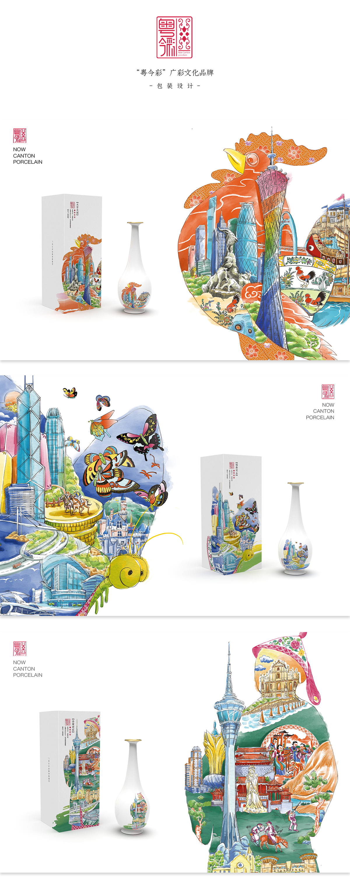 广彩是广州地区的釉上彩瓷,以构图繁密、色彩艳丽、金碧辉煌为特色,公鸡、蝴蝶、人物纹是广彩中的经典纹样。本设计拟定“粤今彩”广彩文化品牌,将广彩传统元素与现代设计相结合。设计作品选取广彩中的公鸡、蝴蝶、人物纹作为图形元素与粤港澳三座城市的文化、交通、建筑等元素相结合。通过设计出一系列插画、辅助图形、品牌标志进行应用,线上线下结合以达到推广目的。
