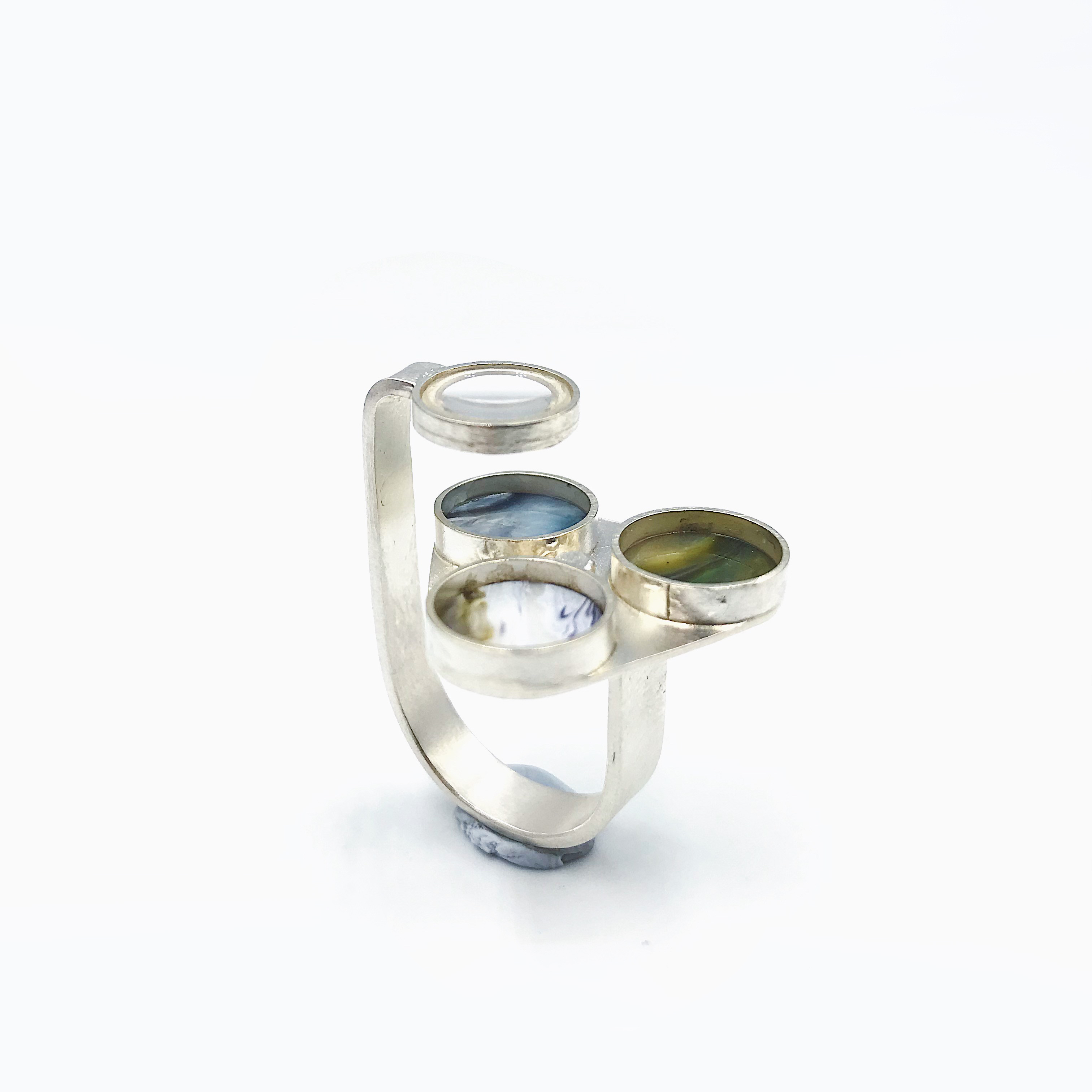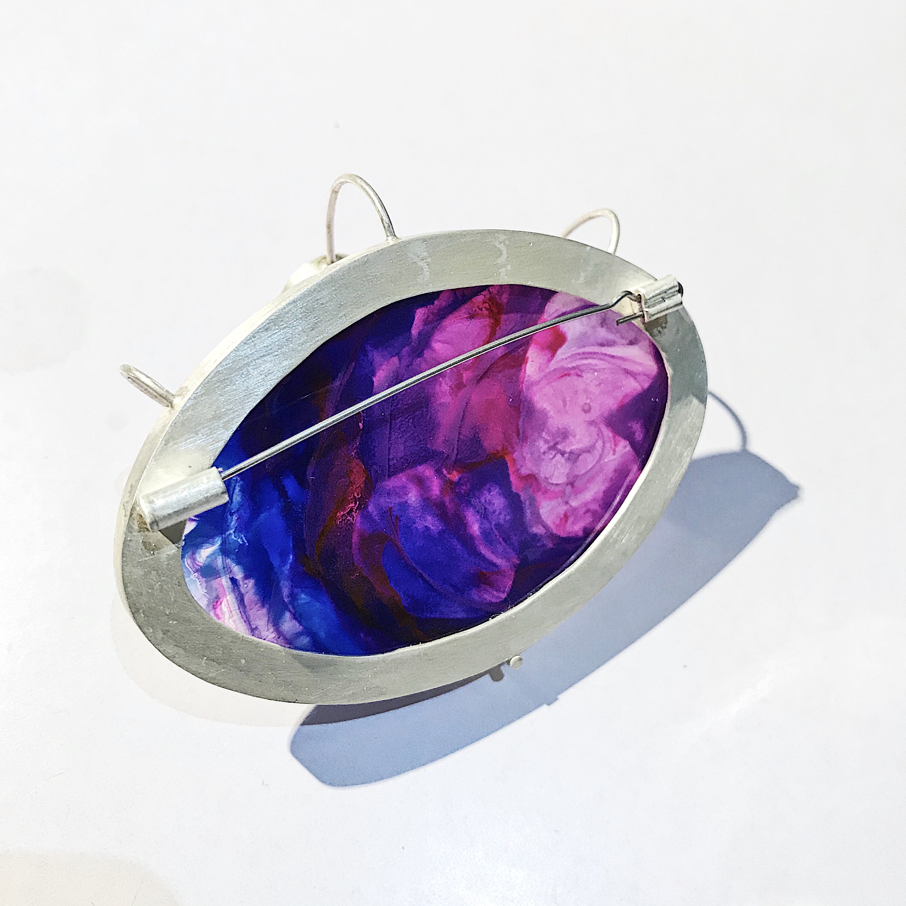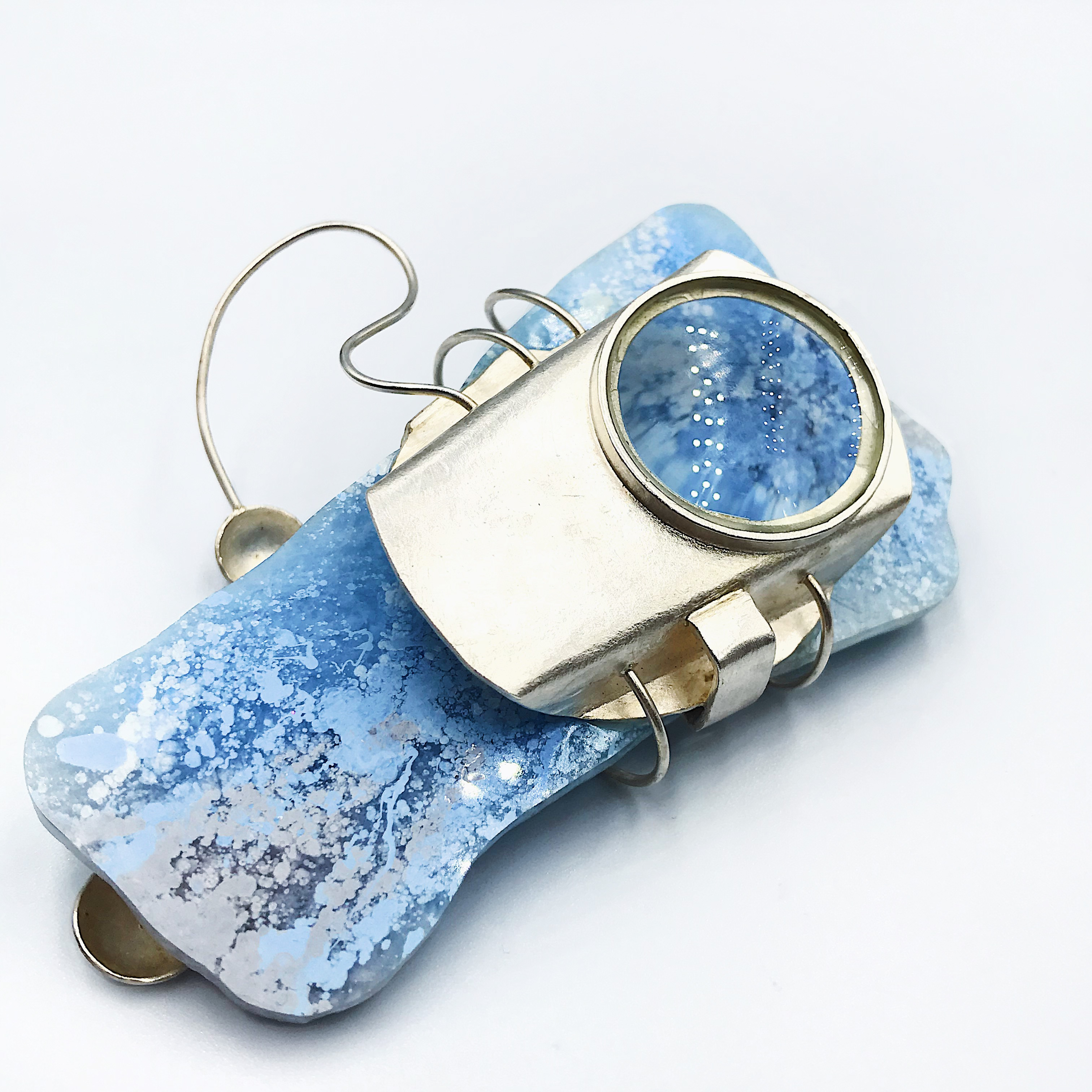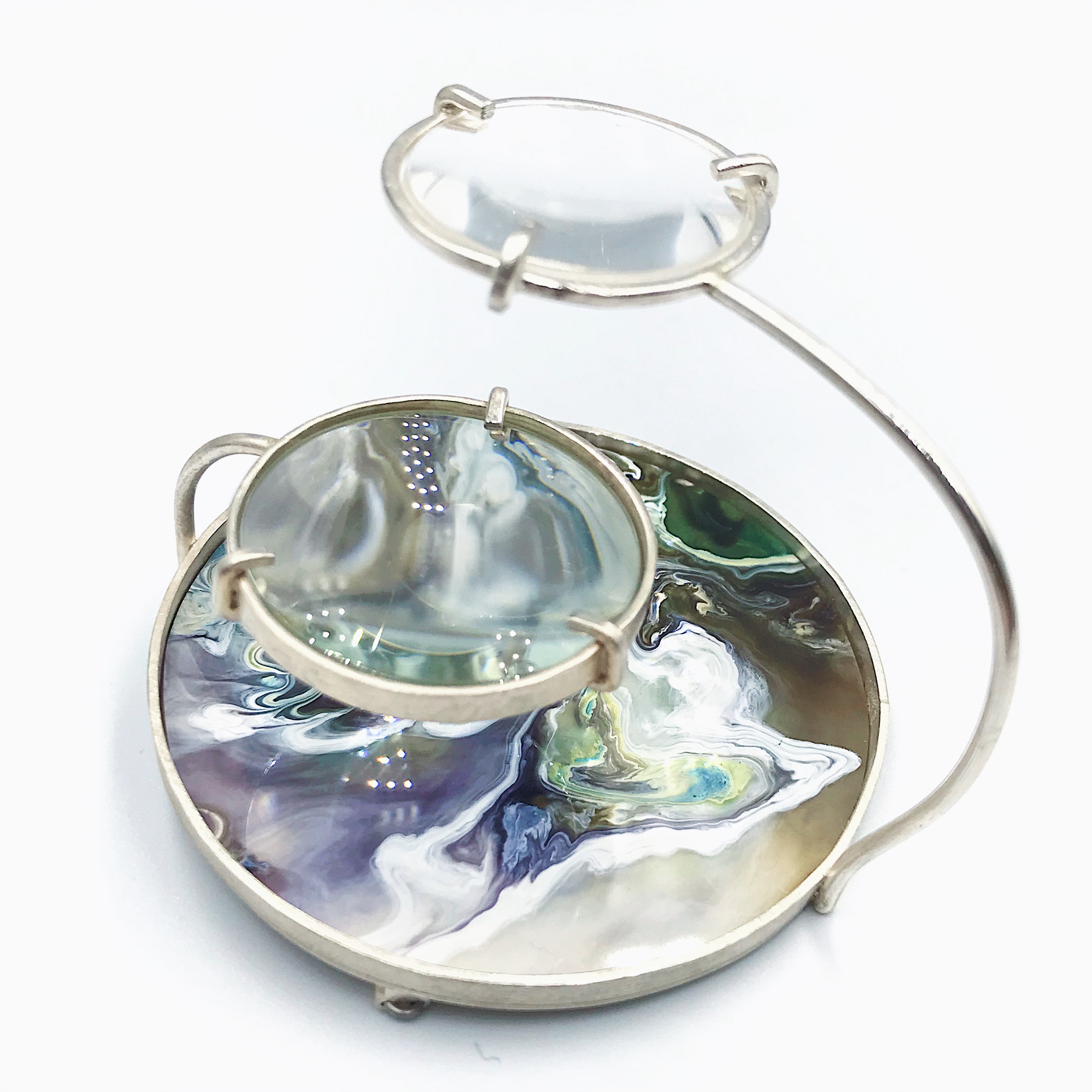 在这次设计中我着重首饰的色彩创作,表达出梦境中的色彩,梦中沙滩,山川肌理的表达,天马行空的、科幻云彩的表达。材料上运用到放大镜来观察色彩的变化去感受内心的波澜,运用到纯银对树脂进行了再加工,对其进行链接。通过滴剂的色彩晕染,来描绘潜意识的脑内奇景,讲述某个风景独特地方的天空、山峰或河流等梦境中的碎片给我传递的情感。在记忆的碎片里拼凑着各种梦幻般色彩的天空和夜晚里的星河。将梦中的场景重组定格在首饰中。徘徊于具象与抽象之间,是意识与潜意识的碰撞,饱满的情感表达清晰可见。
