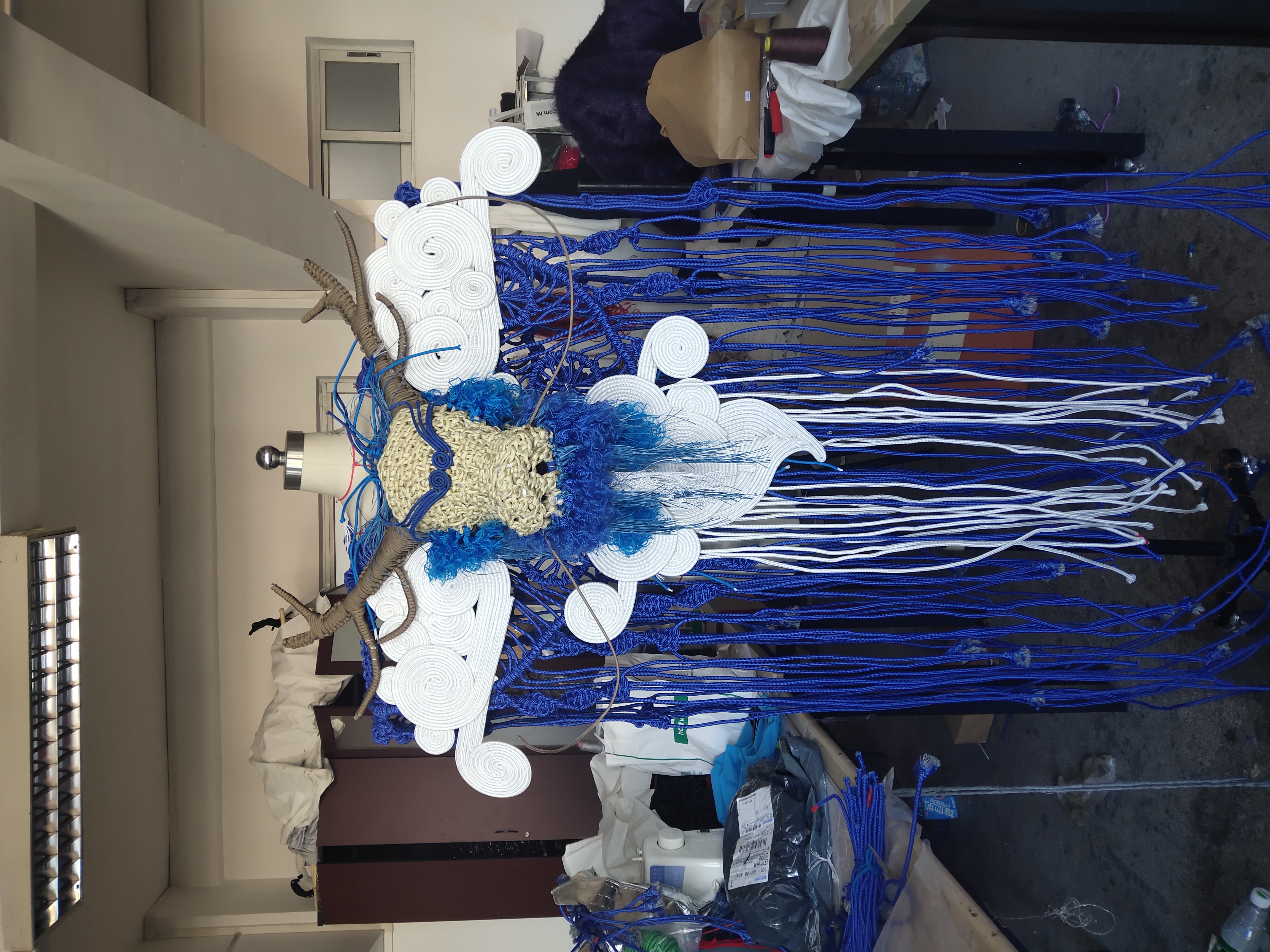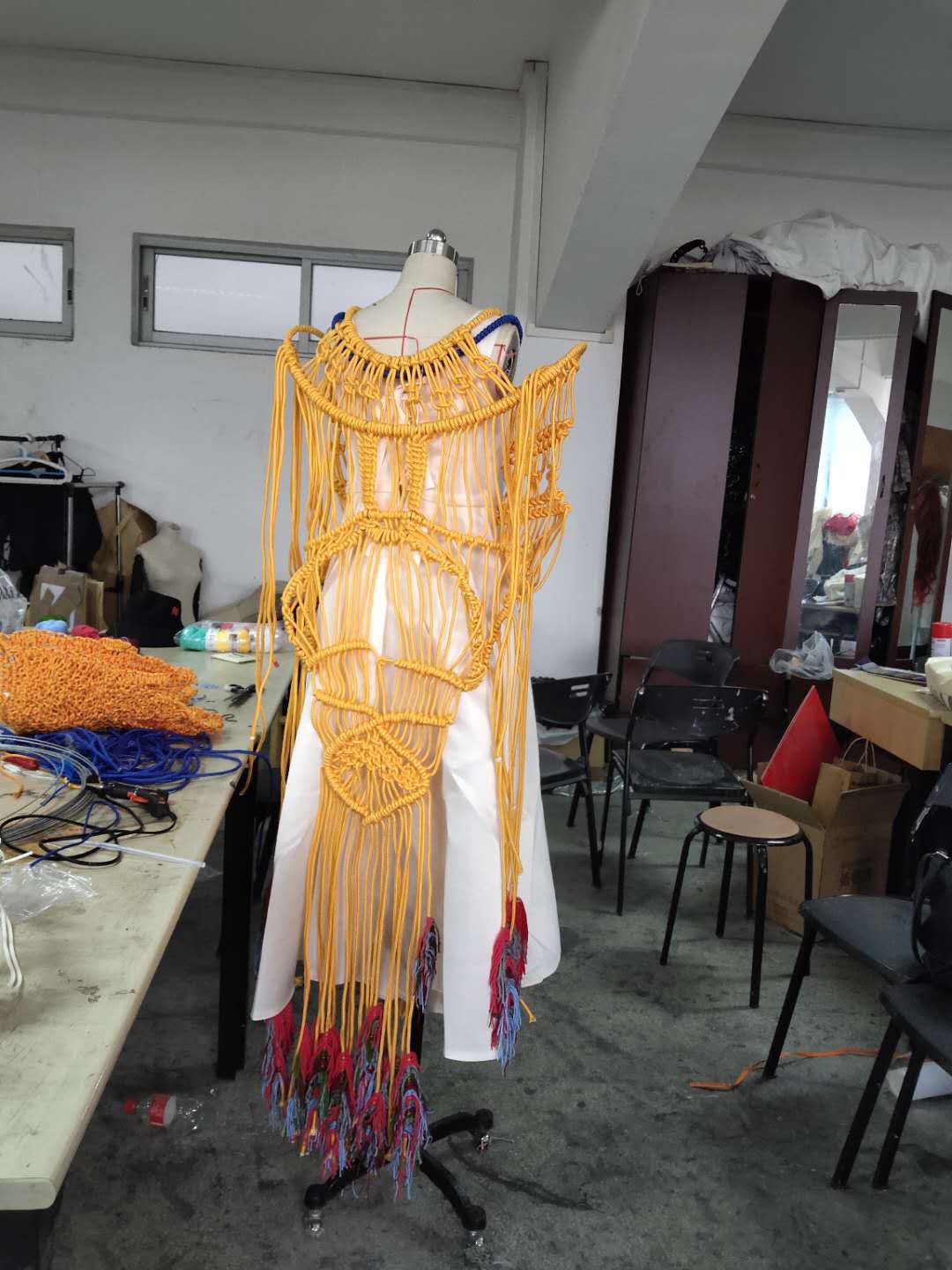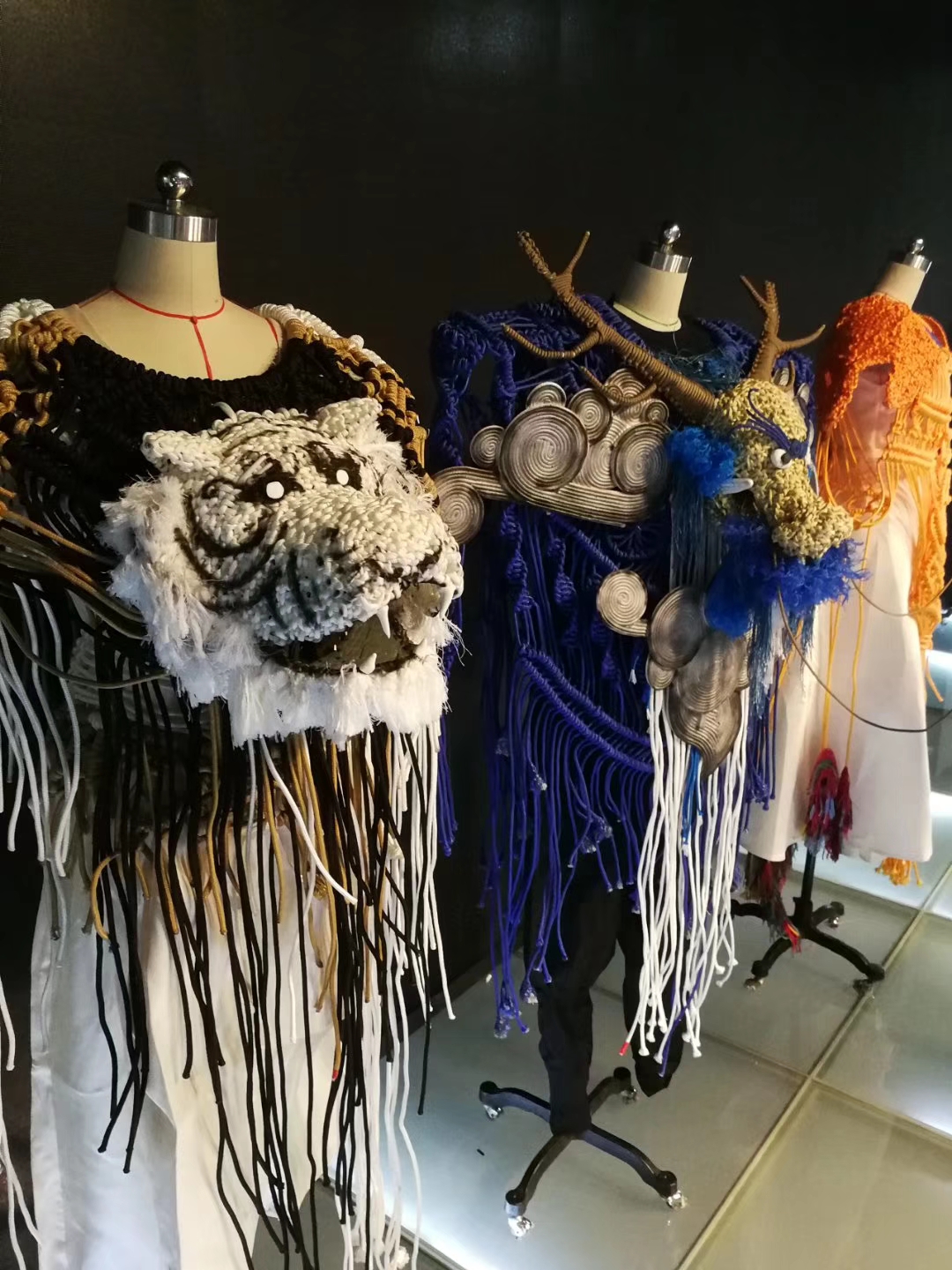 “四象”服装设计系列作品一共4套,在服装设计中主要表现在云肩上面,大色调方面统一采用灰色系,局部色调结合四象相应的五行特征,已经对四象的元素了解进行微调,使系列作品更加贴合四象的玄幻、飘渺和神秘。材料方面,6mm涤纶丙纶编织绳和铁丝两种结合使用,通过铁丝充当造型支撑骨架,6mm编织绳编织覆盖,形成立体的纤维浮雕,再搭配上疏密不一的纹路和图案,层次感丰富。辅料方面,使用棉线和棉绳,搭配不同颜色或者以喷泵和喷笔的喷绘的形式,使接近相应动物的毛发已经产生渐变效果。