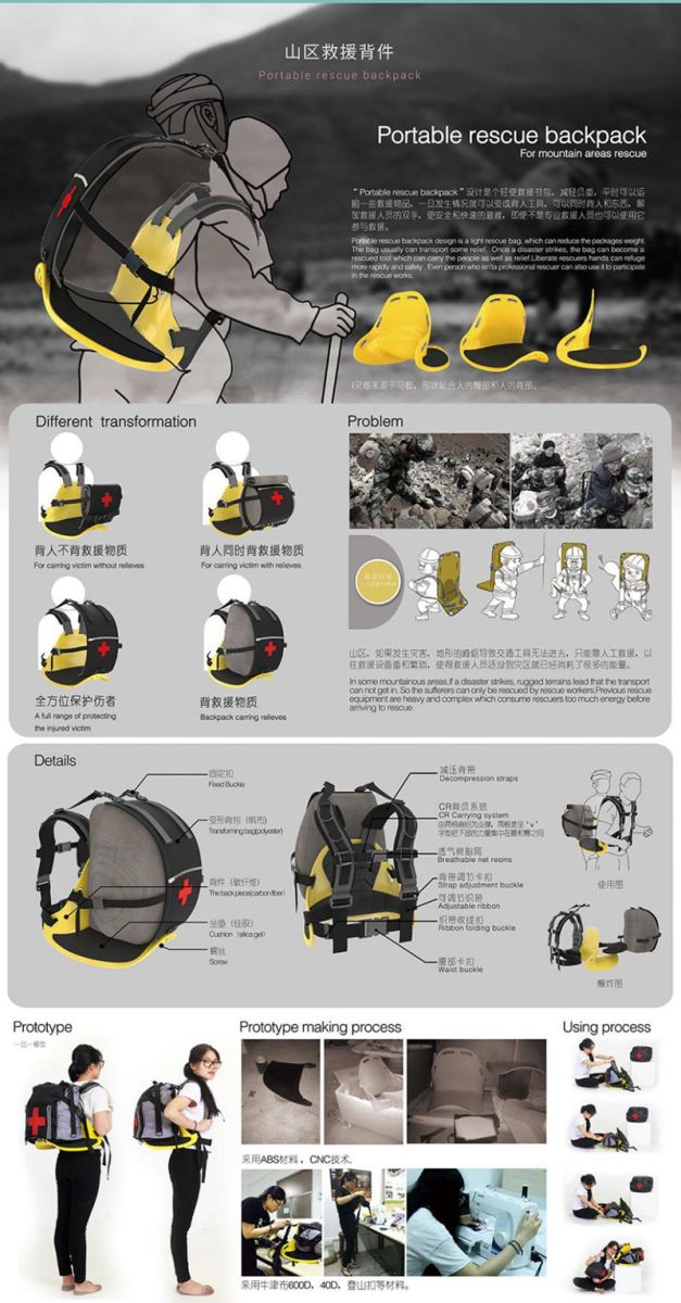 “Portable rescue backpack”设计是个轻便救援书包,减轻负重,平时可以运输一些救援物品,一旦发生情况就可以变成背人工具,可以同时背人和东西,解放救援人员的双手,更安全和快速的避难,即便不是专业救援人员也可以使用它参与救援。