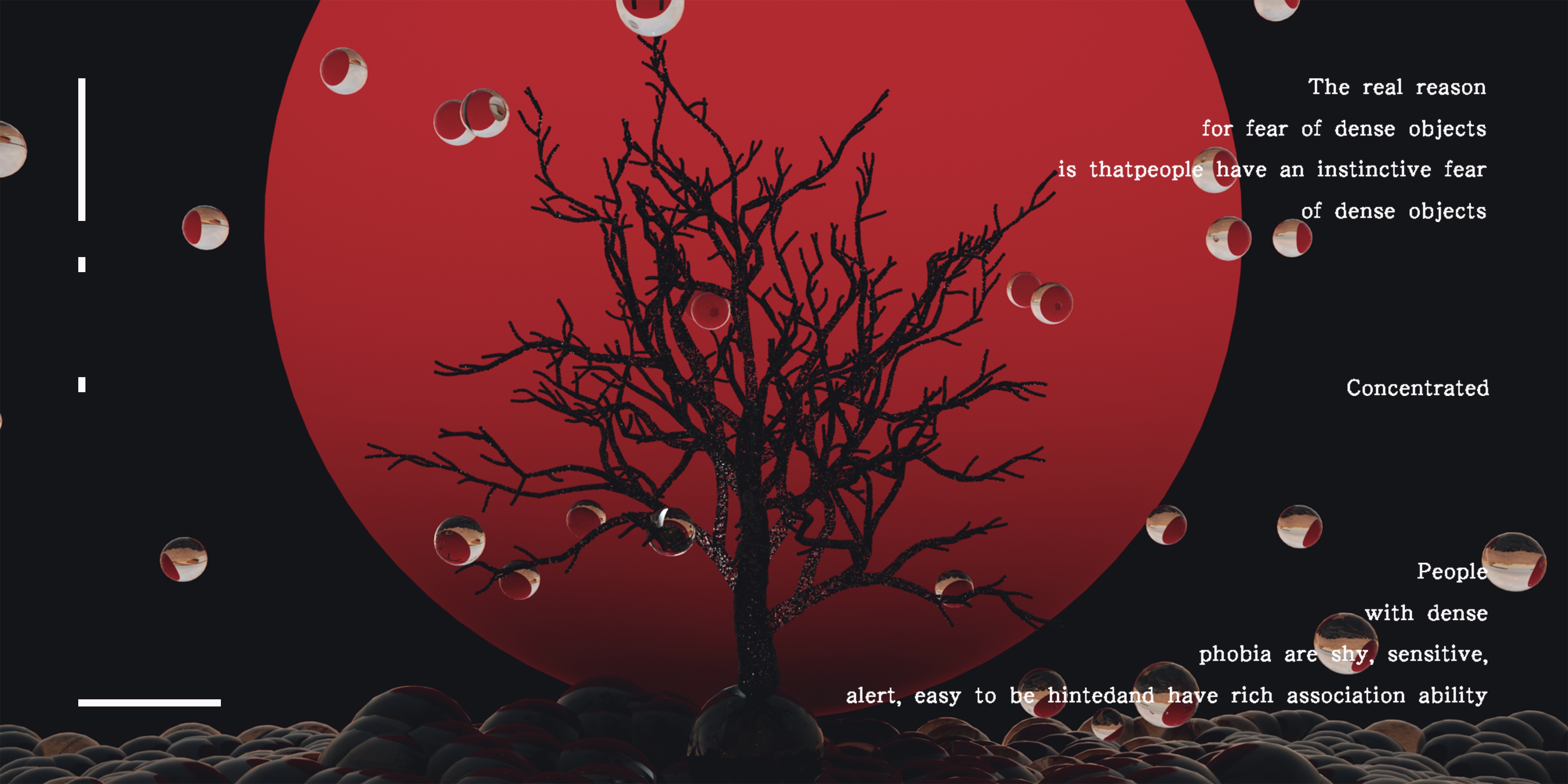 作品《密恐·视界》的宗旨是,让更多的人认识密集恐惧症人群,减少和避免密集视觉对患者的伤害,同时作品也可以用于脱敏治疗的方法,去治愈患有密集恐惧症的人群。