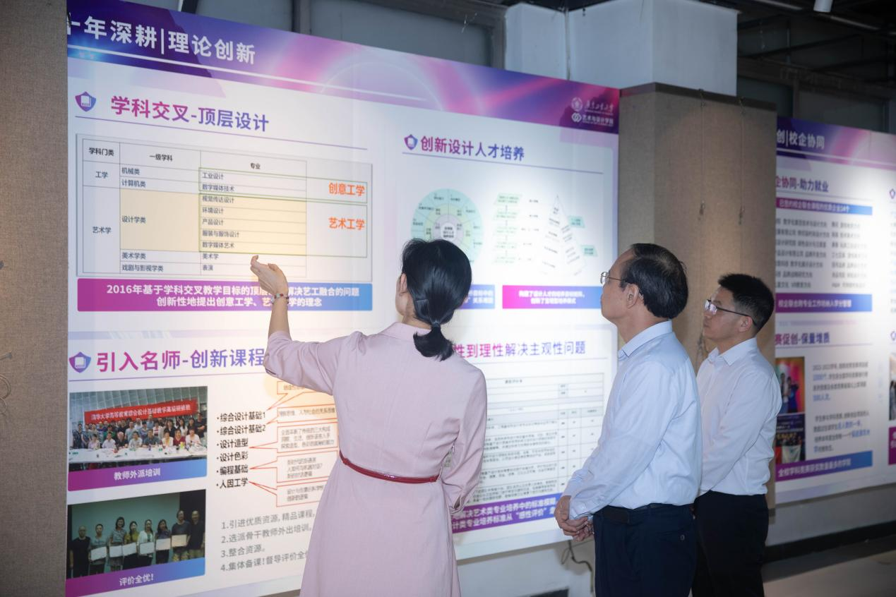 邱学青在观展后仔细了解了学院近年在学科发展、社会服务、科研创新、环境氛围提升等方面的建设成效,对学院在AI艺术设计教育方面率先布局和积极探索给予了充分肯定。他强调,学院要抓住新一轮数字革命浪潮,乘势而上,继续深挖专业优势,紧密结合时代需求,充分探索人工智能技术与艺术设计的创新融合,不断提升学科建设水平和人才培养质量,促进产教融合、科教融汇向纵深发展,加快推进学校“1+2+3”攀撑计划学科提升工程,推动高水平创新型大学建设。