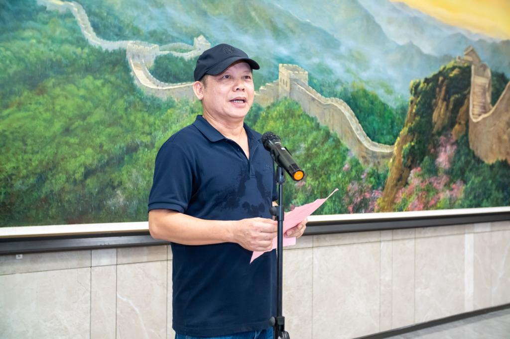美术系教授、广州市美术家协会副主席张洪亮,介绍了创作历程以及作品采用的独特技法与万里长城、旭日东升等意象元素,由技入道、借物寓意,作品饱含了对国家繁荣富强、人民幸福安康、学校事业蓬勃发展的美好期许。
