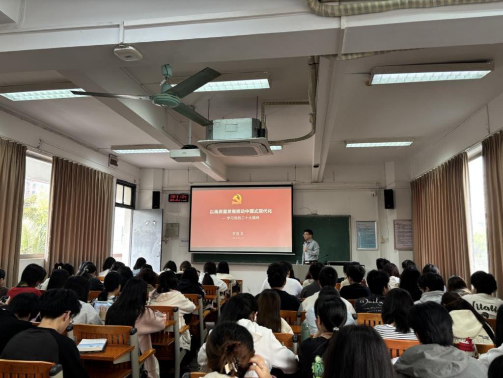 罗胜京围绕“走好中国式现代化之路”“准确把握高质量发展的科学内涵”“锚定高质量发展首要任务,奋力谱写高质量发展新篇章”“争做有理想、敢担当、能吃苦、肯奋斗的新时代好青年”四个方面展开讲述。围绕党的二十大赋予教育新的战略地位、历史使命和发展格局,结合党的二十届三中全会通过全面深化教育综合改革的决定,立足学校紧扣新一轮高质量发展主题推动建设高水平创新大学的工作实际,他指出广大艺设青年要勇于、敢于承担新时代下的重要使命和重大责任,一是要树立大局意识,从内心深处厚植对中国共产党的信赖、对中国特色社会主义的信心、对马克思主义的信仰;二是要把握时代发展脉搏,培育创新意识与创新能力,用设计新质力解码中国式现代化,赋能粤港澳湾区高质量发展;三是要满怀信心、自立自强,以实干为要,努力将自己打造为复合型、创新型、应用型人才。
